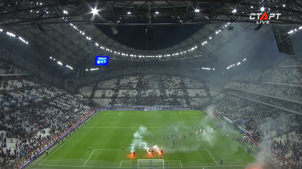 Фанаты Марселя бросают файеры на поле после вылета из Кубка Франции